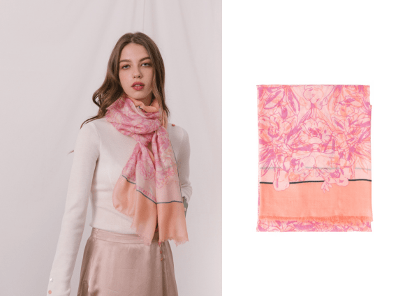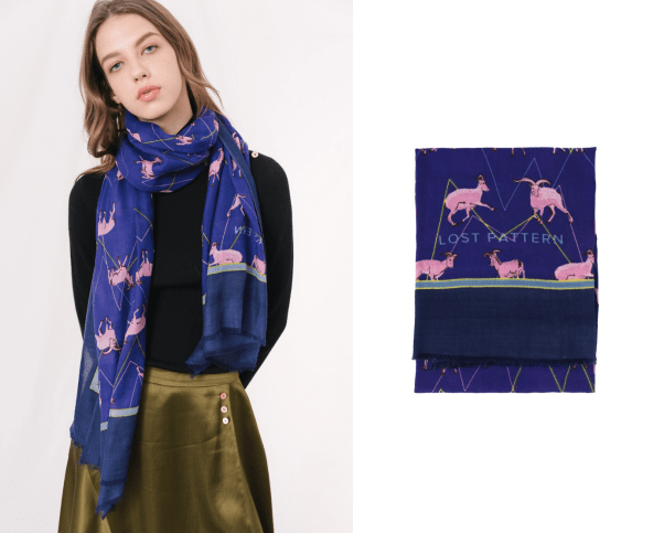寒冷的冬季,精纺的羊毛披肩也非常适合作为礼物送给生活时尚精致的女性。LOST PATTERN推出的这两款羊毛披肩的印花图案分别以高寒地区常见的美丽花朵高山杜鹃和喜马拉雅山上生活的精灵岩羊为主角,采用薄如蝉翼、轻盈细腻,精纺200支水溶羊毛面料,触感宛如婴儿肌肤般娇嫩温润。