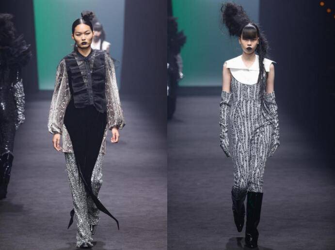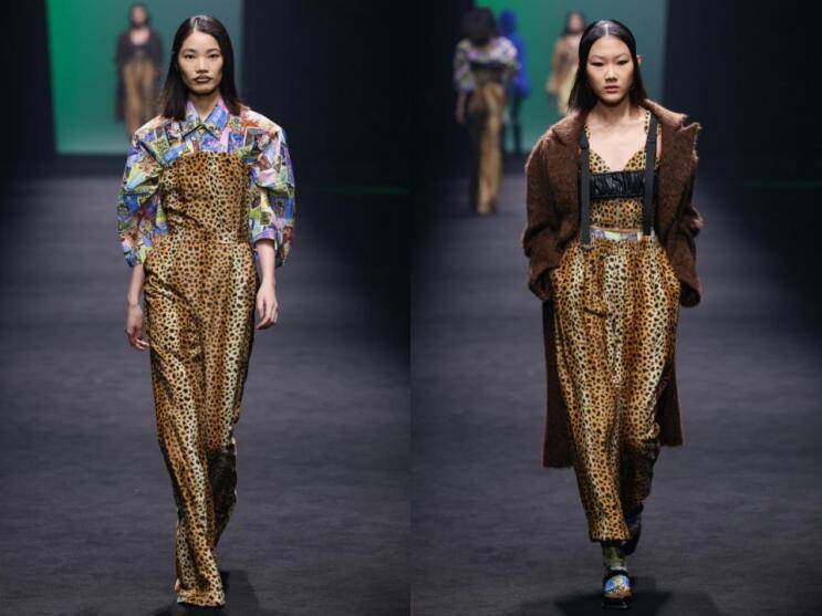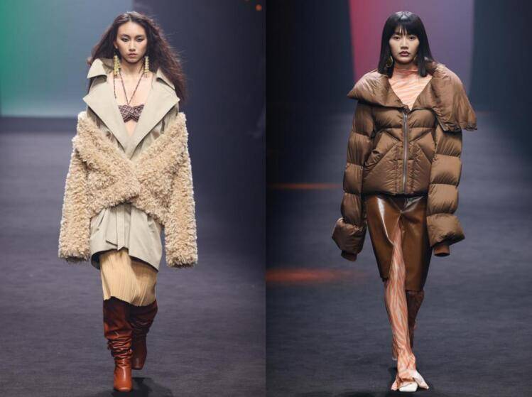 银光亮片的拖地裤、束腰垫肩的廓形西装,亮色冲撞的大衣,野性十足的豹纹裤、复古瑰丽的水貂毛,超大体积感的太空棉服等,一众超模身着DJFL2021秋冬设计系列陆续出场,不紧不慢的步调,在富有节奏的音乐下,流露出沉稳自信的情绪。