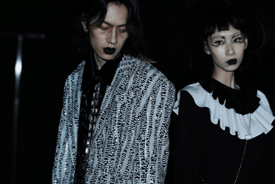 看了本季DJFL 2021秋冬系列不难发现,DJFL很擅长妆容的运用,比如在这种夸张廓形之下,搭配重眼线黑唇细节的点缀。配饰的设计也张力十足,极具戏剧性。