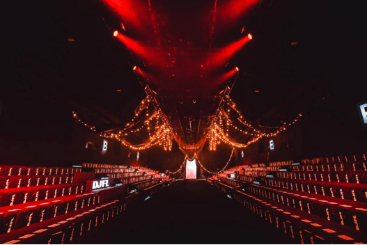本次DJFL秀场空间设计基于戏剧表演场的设计灵感,隐没于昏暗灯光与朦胧烟雾中,打造出梦幻而神秘的空间氛围,模特在迷幻动感的音乐里穿梭,上演一场妙趣横生的绮幻旅程。