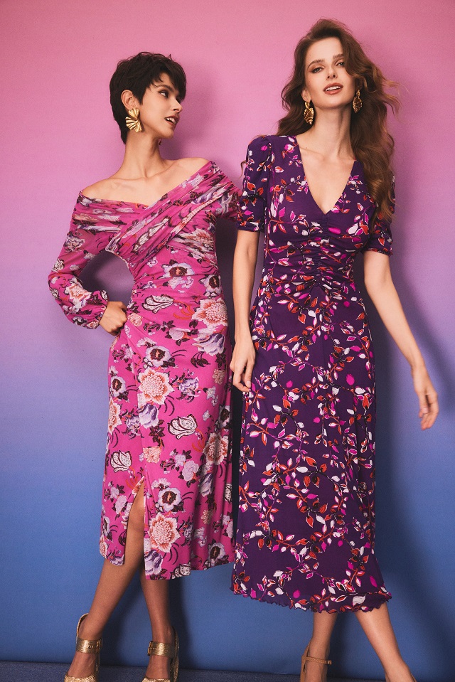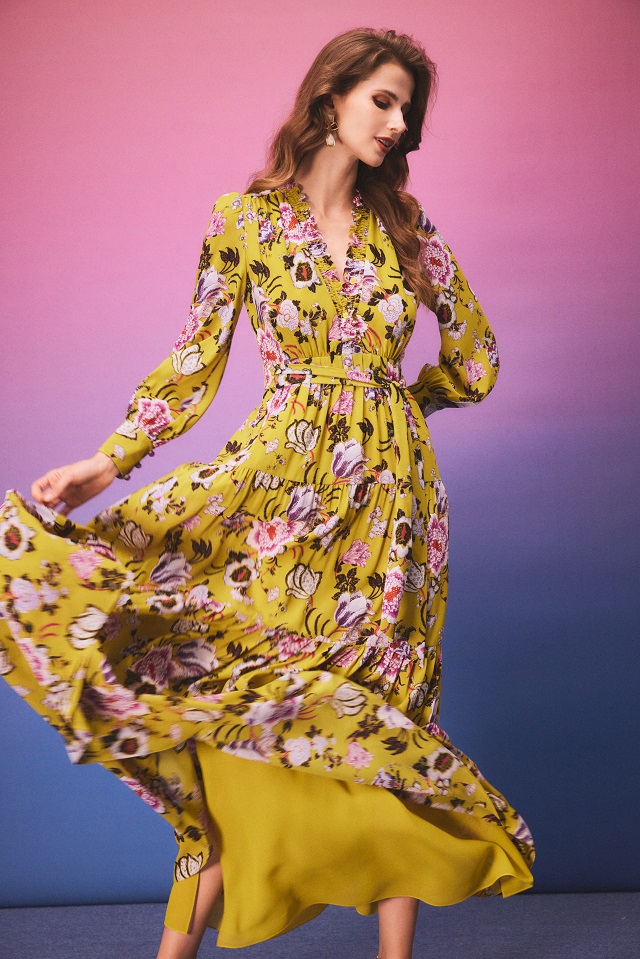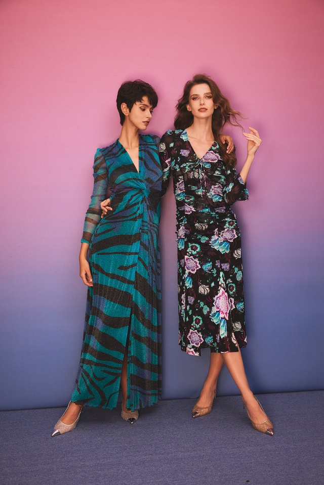 这一季,DVF将标志性的设计语言化作月光的延伸:「WILLOW FLOWERS 柳枝花卉印花」在柔粉底色上晕染出朦胧诗意,宛若透过薄云洒落的月华;在明黄底布上则焕发着朝阳般的暖意,诠释着自在从容的优雅姿态。「ETHE REAL VINE以太藤蔓图案」以品牌独家专利的针织桑蚕丝为载体,在魅紫色调中勾勒出流畅的裹身裙轮廓,其独有的弹性与抗皱特性,让女性身姿在行动间自然舒展,尽显柔韧力量。而标志性的「GOLDEN LIPS金色唇纹印花」点缀于轻盈网纱之上,无论是连衣裙的惊艳设计还是衬衫的精致细节,都将创始人的自信魅力转化为当代女性的风格宣言。
