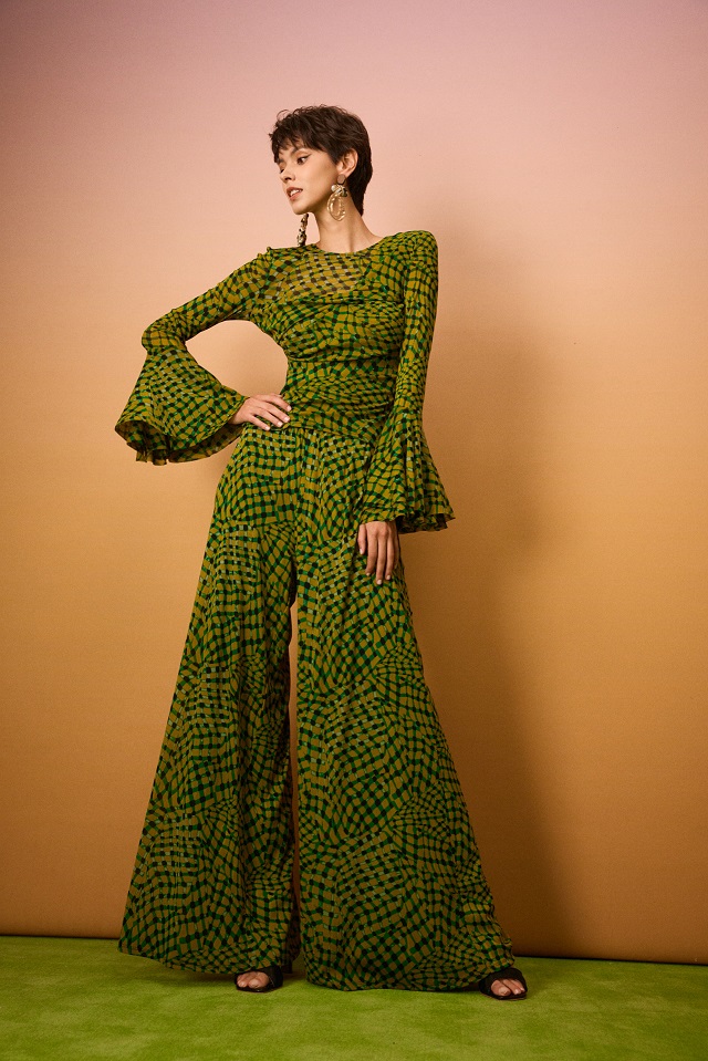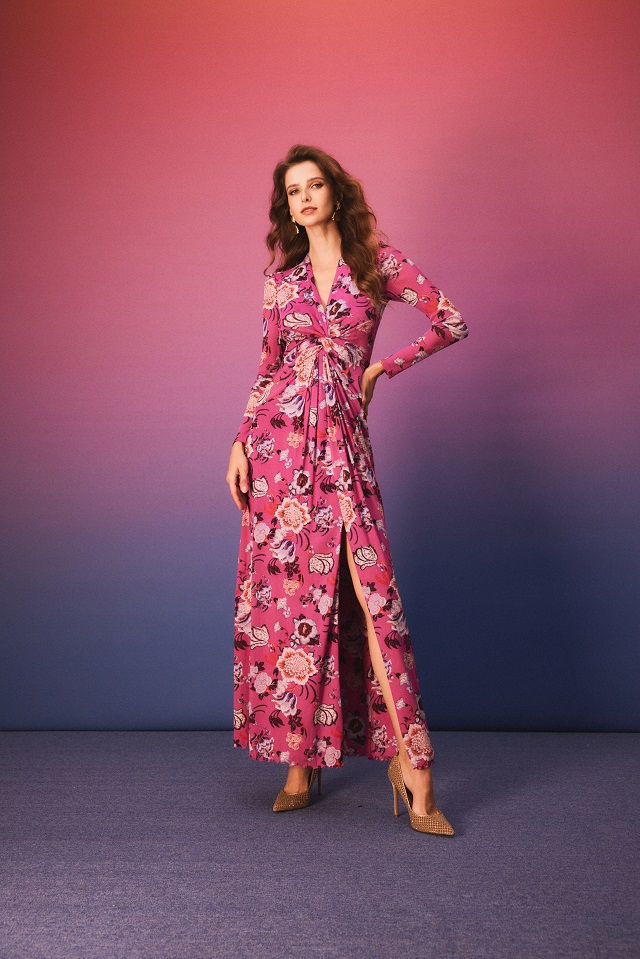 暮色四合,天际缀满星辰,DVF以都市夜色为画卷,开启一场光影与情感的温柔对话。霓虹的绚烂与月辉的清冷在夜空中共舞,如同晚宴中交织的视线与未尽的私语,编织着瞬间与永恒的浪漫诗篇。从午夜花园采撷舒展的枝叶与缠绵的藤蔓,用都会美学的笔触将其重构,让自然的灵动形态与时装的流畅轮廓完美相融。