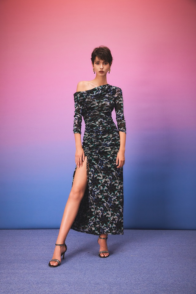 「ODILE VINE HAWTHORNE GREEN 奥戴尔藤蔓图案」运用独特的烧花刻印工艺,在透视网纱上雕琢出精致的丝绒花纹,令墨绿底色与藤蔓图案相映成趣;「LACE FLOWER 复古蕾丝印花」则以立体提花工艺在弹力网纱上绽放,将花卉蕾丝的柔美与丝绒网纱的复古完美融合。在款式设计上,「CAPSULE LIPS SIGNATURE RED 红唇锁爱印花」化作宴会礼服裙上的惊艳点缀,丝绒网纱与炽烈红唇的碰撞,于镁光灯下绽放夺目光彩。「BATIK DOT IVORY黑白波点」借性感落肩设计展现摩登气质,黑白波点在丝绒网纱上轻盈跃动。而「 INK TIGER水墨虎纹」更在蓝调金属网纱上演绎东西方美学的对话,金属针织打造星辉微光的动人感,诠释着现代女性的刚柔并济。这些看似对立的元素在DVF的设计中和谐共存,正如现代女性在都市生活中展现的多面魅力。