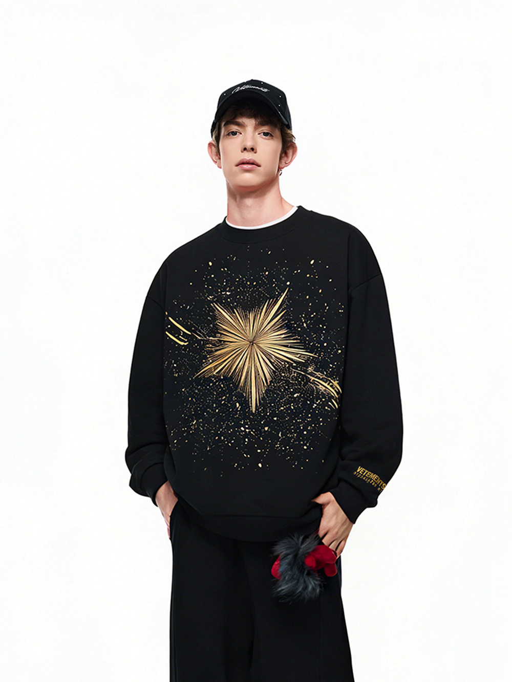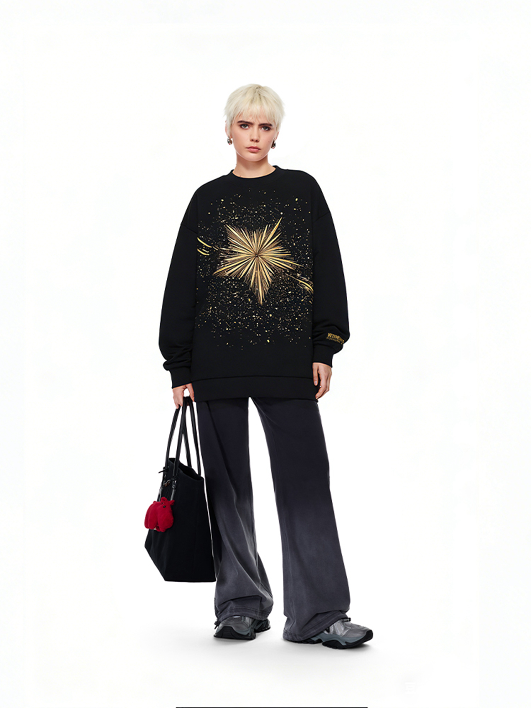 第一套适配轻松街头的元旦出行:26SS「super star」系列黑色卫衣是核心单品,胸前鎏金烟花星星元素铺陈于细碎金闪底色之上,自带节日氛围感;搭配渐变灰阔腿裤与休闲靴,宽松版型兼顾假期出行的舒适感。