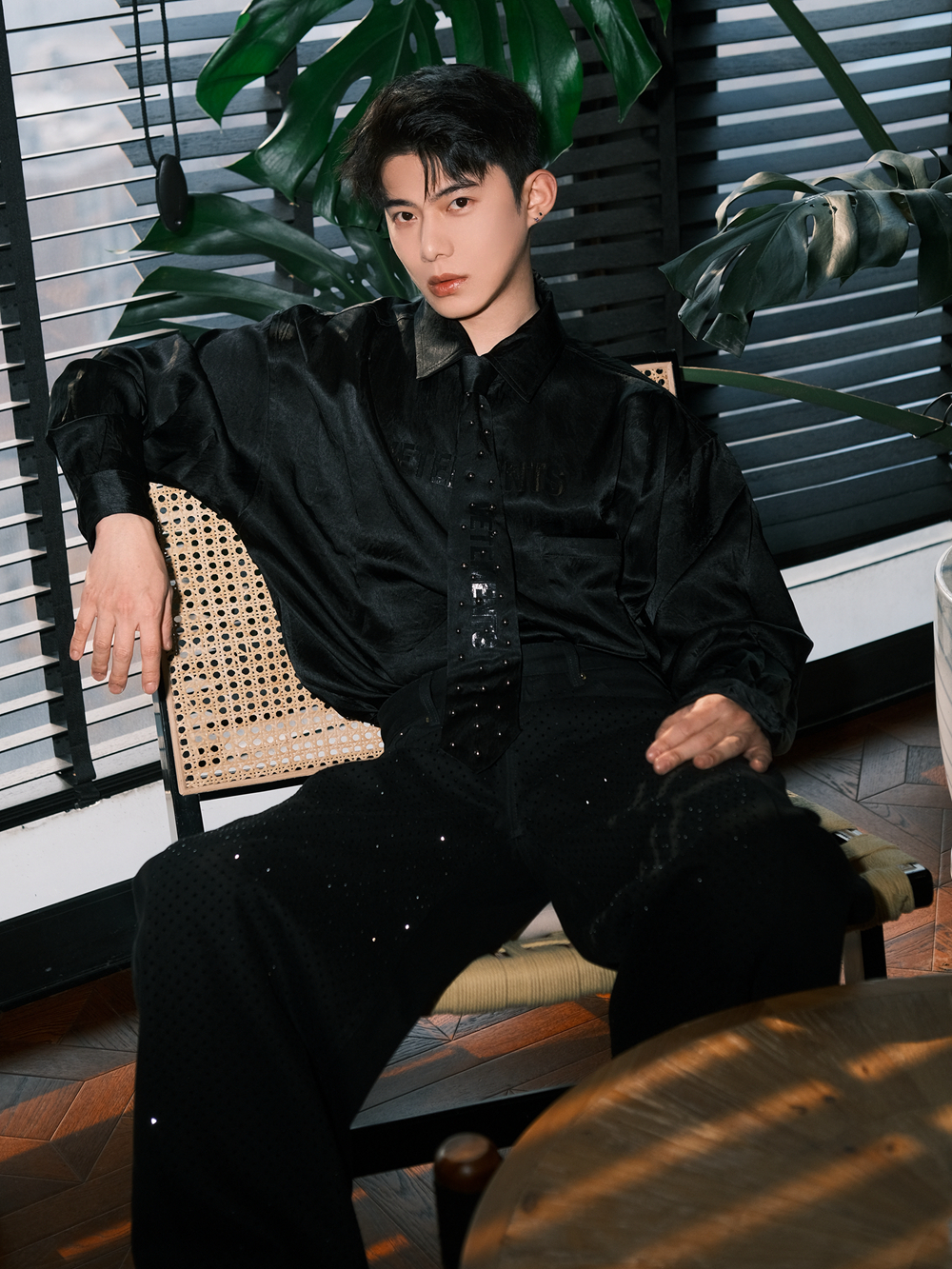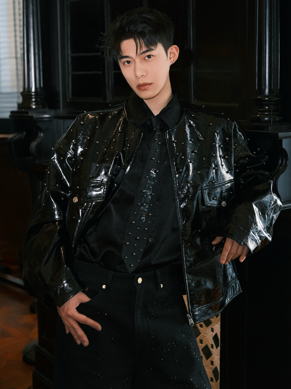 元旦有年会、晚宴等社交场合,第二套26SS「super star」系列造型恰好契合:纯黑立体剪裁夹克融合错位解构设计,高级定制钉珠工艺让面料在闪光灯下折射细碎光泽,内搭丝绸感醋酸衬衫与同系列钉珠领带,整体造型既保留了先锋未来感,又契合节日社交的精致调性,轻松稳居视觉C位。