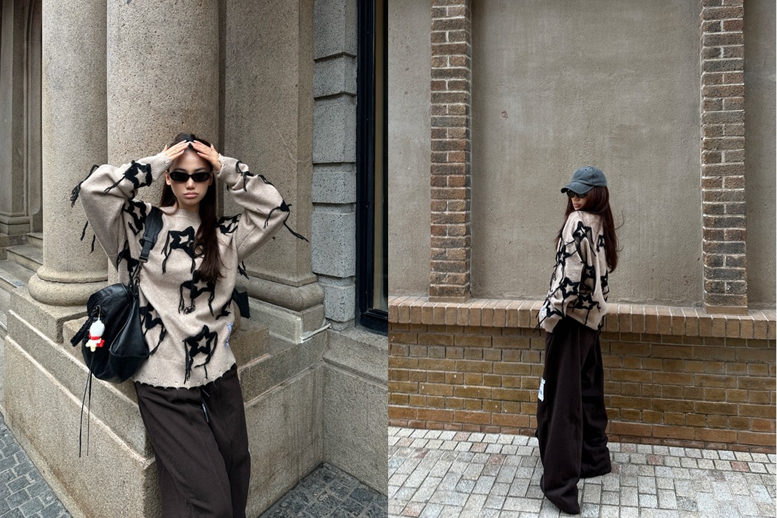 假期citywalk的穿搭则可以选择第三套VETEMENTS 25冬季圣诞胶囊系列:经典褐灰色毛衣上的黑色星芒图案搭配流苏装饰,自带慵懒松弛感,搭配深棕阔腿裤与厚底靴,再用灰调棒球帽增加随性感,适配秋冬街头的文艺氛围,元旦逛展、压马路都能兼顾保暖与造型感。